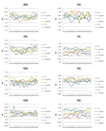 Values of fractal dimension on all measurement points through the length of wires (FD—fractal dimension, A1–E3—measure points, AN—Adenta NiTi, FN—Forestadent NiTi, ON—Ormco NiTi, GN—G&H NiTi, AS—Adenta Steel, FS—Forestadent Steel, OS—Ormco Steel, GS—G&H Steel).