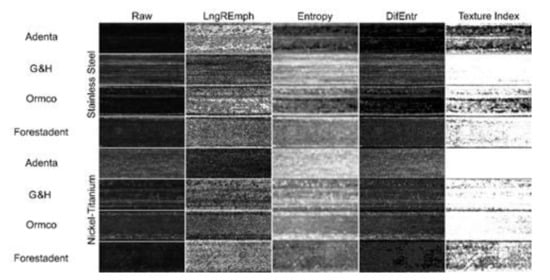 Texture analysis. Surface image transformations of example orthodontic wire samples made of stainless steel and nickel-titanium. Raw (microphotography): Light microscope images. The brighter places correspond to flat smooth areas that reflect visible light more strongly due to this surface. LngREmph: A feature of the series length matrix that reveals areas that similarly reflect incident light. White areas (high values of this texture feature) correspond to elongated horizontal micro-reflections of similar light. This feature does not differentiate continuous dark areas from continuous light areas. Entropy: Reveals a surface with evenly scattered areas of similar brightness (smoothness). Note that Entropy remains in opposition to LngREmph, i.e., areas of high LngREmph feature values occur in areas of low Entropy value, and vice versa. DifEntr: Enhances (shows as whiter) areas made up of evenly scattered areas similarly reflecting incident light (similar surface smoothness). This feature more strongly differentiates the analyzed surface into poorly differentiated areas (black) and highly differentiated areas with a chaotic arrangement of smooth plots (white). By comparing the appearance of this map with the photographic image it can be concluded that the smooth areas of the photographic image correspond to an accumulation of areas of high Difference Entropy. Texture Index (TI): the white areas represent high TI values on the wire surface in the map. The darker the area, the lower the TI value represented by that region. The texture of the wire surface is represented by a lighter area the smoother areas originally entered the archwire photographic image at that location (see next figures), magnification 36×.