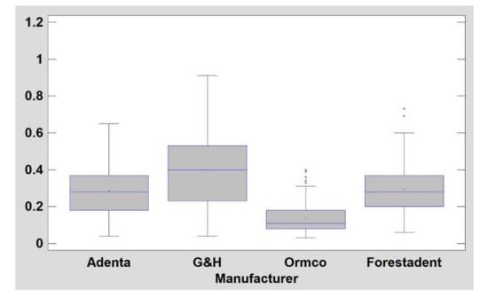Statistica version 13.3 (StatSoft, Cracow, Poland) was used to perform all statistical tests. A statistical significance level of 0.05 was assumed. The Shapiro–Wilk test was used to confirm the normality of distribution. Due to the normal distribution of samples, we performed parametric tests. Student’s t-test was performed to check statistical differences between various materials of the same manufacturer. Analysis of variance (ANOVA) and post hoc least significant difference were applied to reveal fractal dimension differences between surfaces of wires of the same type and between producers. The correlation matrix was used to estimate the correlation of FD between two surfaces of the same wire.