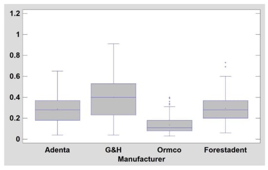 NiTi archwire comparison (mean side 1 and side 2 texture index, TI; higher TI means better result). Adenta wires are significantly (p < 0.05) smoother than the last 3 manufacturers’ products. G&H are significantly better (p < 0.05) than Ormco and Forestadent wires. Moreover, Forestadent wire is worse than all other products (p < 0.05), y axis indicates values of texture index.