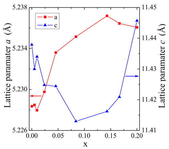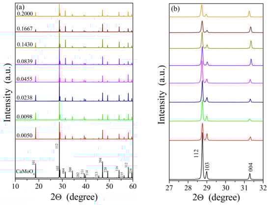 The powder XRD patterns of pure CaMoO4 and CCGMWO solid solution with different content of Gd3+ ions, i.e., when x = 0.0050, 0.0098, 0.0283, 0.0455, 0.0839, 0.1430, 0.1667, 0.2000, and the constant concentration of Co2+, i.e., y = 0.02 are shown in Figure 1a,b. XRD analysis shows that the powder diffraction patterns of new Co2+-doped and Gd3+-co-doped calcium molybadato-tungstates consisted of diffraction lines. These lines can be attributed to scheelite-type framework. No impurity phases, i.e., initial reactants, metal oxides, and other gadolinium tungstates or molybdates were observed with increasing gadolinium ions concentration only up to x = 0.2 (33.33 mol% of Gd2(WO4)3 in initial CoMoO4/Gd2(WO4)3/CaMoO4 mixtures when y is constant and equals 0.02, i.e., 3.00 mol% of CoMoO4). The observed diffraction lines attributed to the scheelite-type structure kept their position or shifted slightly towards the lower 2Θ angle with increasing Gd3+ content. All registered peaks were successfully indexed to the pure tetragonal scheelite-type structure with space group I41/a (No. 88, CaMoO4 − JCPDs No. 04-013-6763). This fact confirmed the formation of a new solid solution of CoMoO4 and Gd2(WO4)3 in CaMoO4 matrix. The diffraction patterns of samples comprising initially above 33.33 mol% Gd2(WO4)3 in initial CoMoO4/Gd2(WO4)3/CaMoO4 mixtures (not shown in our manuscript) revealed simultaneously presence of peaks attributed to the saturated solid solution (when x = 0.2 and y = 0.02) as well as the diffraction lines characteristic Gd2(WO4)3. It means that the solubility limit of gadolinium tungstate in CaMoO4 crystal lattice when the initial concentration of CoMoO4 was 3.00 mol% is not higher than 33.33 mol%.