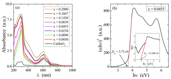 (a) UV–vis absorption spectra of CaMoO4 and CCGMWO samples; (b) Plot of (αhν)2 vs. hν for CCGMWO (x = 0.0455, y = 0.02) and determined band gap energy; (insert)—plot of ln(α) vs. hν for this sample and determined Urbach energy.