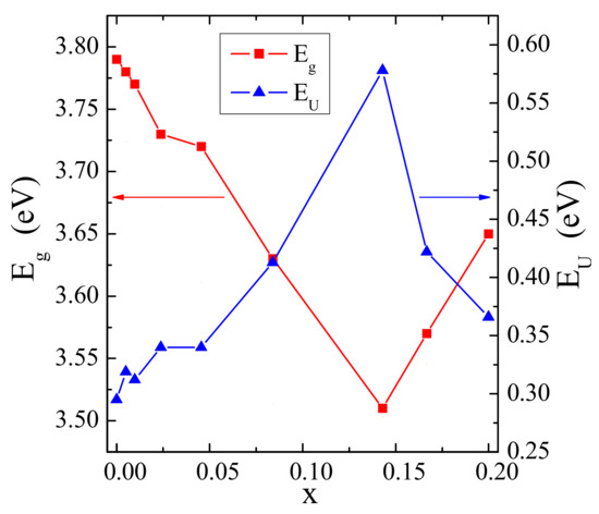 The incorporation of doping ions into the structure of some materials often reveals a formation of band tailing in the band gap due to a formation of localized states. The band tail energy (Urbach energy, EU) characterizes the width of located states, and the empirical Urbach’s relation express it [27]: