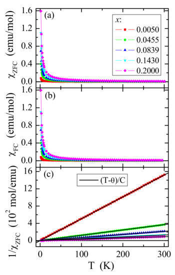χZFC (a), χFC (b) dc magnetic susceptibility and its inverse 1/χZFC (c) vs. temperature T of CCGMWO solid solution for x = 0.0050, 0.0455, 0.0839, 0.1430, 0.2000, and y = 0.02 recorded at H = 1 kOe. The solid (black) line in (b), (T-θ)/C, indicates a Curie–Weiss behavior.
