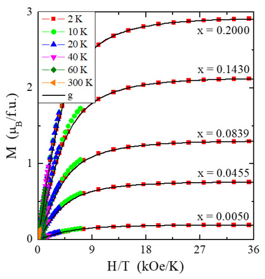 Magnetization M vs. H/T of CCGMWO solid solution for x = 0.0050, 0.0455 0.0839, 0.1430, 0.2000, and y = 0.02 recorded at 2, 10, 20, 40, 60, and 300 K. The solid (black) line indicates a Landé factor fit (g).