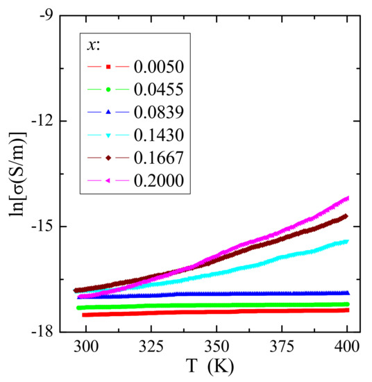 The results of the electrical conductivity (Figure 9) and thermoelectric power (Figure 10) measurements of CCGMWO microcrystals showed insulating behavior with small values of the n-type residual conductivity of σ ~ 10−8 S/m. No thermal conductivity activation of the current carriers for poorer gadolinium samples was observed. This thermal activation is only visible above room temperature for samples richer in gadolinium. In general, the residual electrical conduction of the n-type CCGMWO materials under study seems to be connected with the anionic vacancies. It’s known that in a state of thermal equilibrium, structural defects (n) are always present in the lattice, even in the crystal which is ideal in other respects. A necessary condition for free energy minimalization gives n ≅ Nexp(-Ev/kBT) for n << N, where N is the number of atoms in the crystal and Ev is the energy required to transfer the atom from the bulk of the crystal on its surface [32]. Similar behavior for the following Gd3+-doped lead molybdato-tungstates [28], RE3+-doped tungstates or molybdates: R2WO6 (R = Nd, Sm, Eu, Gd, Dy, Ho) [33], CdRE2W2O10 (RE = Y, Pr, Nd, Sm, Gd–Er) [10,34], RE2W2O9 (RE = Pr, Sm–Gd) [35], AgY1–xGdx(WO4)2 (x = 0.005, 0.01, 0.025, 0.04, 0.10, 0.20, 1.00) [36], and Cd1–3xGd2x xMoO4 (0.0005 ≤ x ≤ 0.0455) [36] were observed.