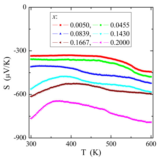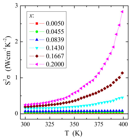 Figure 11 shows an interesting dependence of the power factor S2σ on temperature T. The power factor has a very small value of a few fW/(cmK2). However, its value will significantly increase with the increase in temperature for samples richer in gadolinium ions. Usually, a low value of the power factor suggests rather the hopping transport, magnon scattering, and lower covalence of the studied materials compared to classical thermoelectric semiconductors [37]. Materials with a large power factor value (S2σ) are usually heavily doped semiconductors, such as Bi2Te3 [37]. The above studies show that even in ion-bonded materials, thermoelectric efficiency can be improved by doping them with rare-earth ions. The observed strong dependence of the power factor on the content of gadolinium ions may result from the size effect, as the Gd3+ ions have a large ion radius [19].