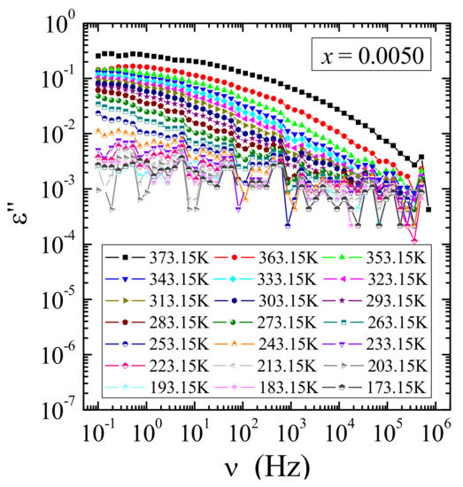 Calculated data from the Kramers–Kronig transformation of the real part of permittiity (ε′) vs. frequency ν of CCGMWO solid solution for x = 0.0050 to the ε″ representation recorded in the temperature range of 173–373 K.