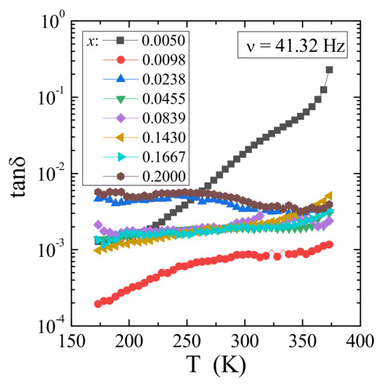 Broadband dielectric spectroscopy measurements of the solid solution under study showed both small values of the real part (ε′) and imaginary part (ε″) of complex dielectric permittivity strongly decreasing with frequency and temperature (Figure 12a–d). Dielectric analysis in the frequency representation showed that no dipole relaxation processes were observed (as in Maxwell-Wagner [38] or Jonscher [39]) on the real and imaginary spectra of representative samples with the content x = 0.0050 (a), 0.0455 (b), 0.0839 (c), and 0.2000 (d) (Figure 12). Only in the case of the sample with the lowest gadolinium content (x = 0.0050) the collected spectra indicated the presence of the relaxation process (characteristic “bulge” on the loss curve, indicated by an arrow, shifting to lower frequencies with cooling). However, calculated data from the Kramers–Kronig transform [18] of ε′ did not reveal a well-defined relaxation peak (Figure 13). The calculated loss tangent values indicated that all samples except x = 0.0050 have tanδ ~0.01, in which the relaxation process is inhibited with increasing gadolinium content in the sample (Figure 14). Both small ε′ and tanδ values can be explained by the fact that Gd3+ ions have the 4f-shell screened. This hinders the formation of electric dipoles and their relaxation. Low energy loss was also observed in Ca1−xMnxMoO4 nanomaterials (x = 0.0, 0.01, 0.05, 0.10, 0.15) [40] and in RE2W2O9 ceramics (RE = Pr, Sm-Gd) [35]. It is worth noting that significantly higher electric permittivity values at low frequencies are characteristic of the polarization of the space charge induced in the sample.