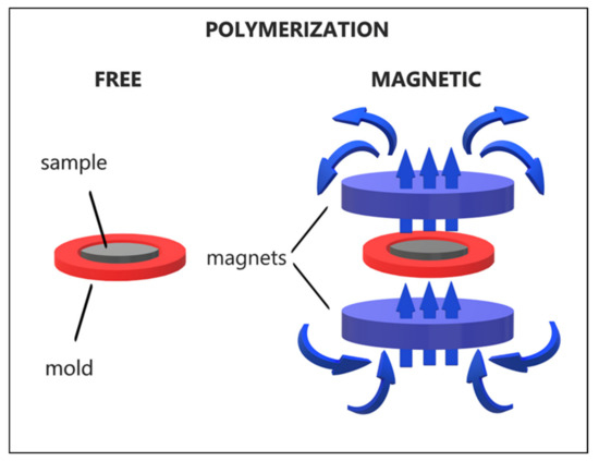 The PDMS base (Sylgard 184, Dow Corning, Midland, MI, USA) and the curing agent with a mass ratio of 10:1 were mixed. Subsequently, the magnetite powders in mass ratio polymer:magnetite of 10:3 were immediately added into the uncured PDMS matrix. After being uniformly mixed, the uncured composite was put into a mold for free polymerization (Figure 1). The oriented sample was obtained by placing the mold into a magnetic field of about 400 mT, as illustrated in Figure 1. Both types of samples were placed in an oven, at 100 °C for 60 min. Thus, we obtained discs of about 10 mm diameter and about 1 mm thickness (Figure 2).