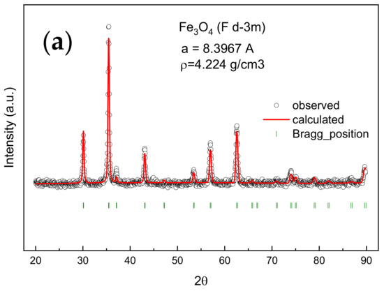 The confirmation of obtaining acicular magnetite was achieved by XRD measurements, presented in Figure 4a. The second experimental route of magnetite fabrication was confirmed also by the XRD measurements, as shown in Figure 4b.