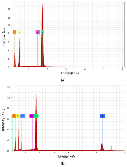 The XRD measurements are in a good agreement with compositional EDS analyses (Figure 6). The characteristic bands of the elements from the polymer base composition (C, O, and Si) appear in all spectra and additionally, when magnetite is dispersed in polymer, the very intense Fe bands are evidenced.