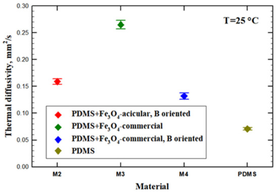 The thermal diffusivity for the investigated materials is plotted in Figure 8. The diffusivity is a direct measure of the thermal inertia of the material. A higher value indicates a faster spread of the heat in the material. Not surprisingly, the higher value is obtained for the sample produced without an applied magnetic field. Since the powder is magnetic (its Curie temperature being at around 580 °C) the dispersed particles tend to spontaneously agglomerate inside the polymer into clusters, which can eventually create magnetite bridges to transport the heat. The thermal diffusivity of magnetite can be deduced from thermal conductivity values measured in [41] and specific heat data from [42] to be between 0.6 and 0.8 mm2/s, that is an order of magnitude higher than the value of PDMS. Thus, contiguity of random patterns of magnetite can provide shortcuts for the heat flux across the sample. Applying a magnetic field creates a more regular pattern for the dispersed powders, which are distributed along the magnetic flux lines, in this case, in the direction parallel to the heat flow. Thus, a decrease of thermal diffusivity is observed for the sample with oriented powders at about half of the value obtained for the sample with unaligned dispersions. It has to be mentioned that using acicular dispersions instead of the commercial powder results in a small increase in thermal diffusivity of that sample compared to the sample with spherical dispersions. A possible explanation might be connected to a better alignment of the shaped magnetite, which could also be concluded for the higher density of this sample (Figure 9), exhibiting a strongly reduced porosity.