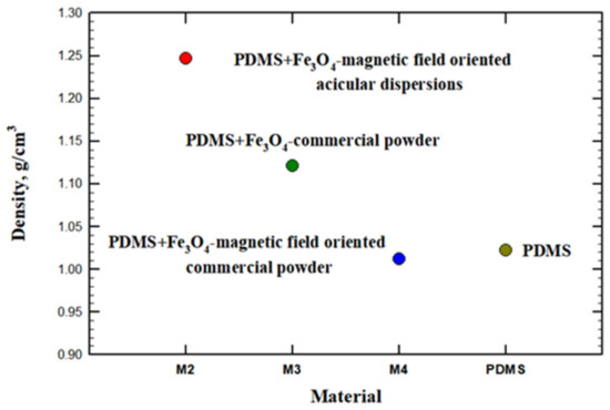 In spite of similar composition, the samples exhibit different densities. Moreover, for the sample prepared using the commercial powder of magnetite polymerized in magnetic field, the density is lower than the value obtained for the pristine PDMS. This can be related to the presence of a considerable amount of closed porosity, as indicated in Figure 5d by the circle.
