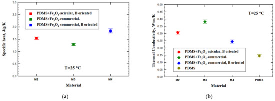 The specific heat values of the investigated samples are depicted in Figure 10a. From a theoretical point of view, the specific heat of a composite material follows the direct mixture rule, i.e., is the pondered sum of the constituents’ specific heat. The PDMS specific heat value was measured by the LFA differential method on a sample without dispersions, while for magnetite we used the values reported in the literature. The deviations observed from the direct mixing rule and among samples can be related to the presence of porosity. Assuming a 0.65 J/g/K specific heat value at room temperature in the case of magnetite [42] and about 1.87 J/g/K specific heat value for PDMS, the expected composite specific heat should be around 1.59 J/g/K. As it can be seen from Figure 10a, the measured values are close to the theoretical value.