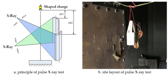 Pulse X-ray (model, manufacturer, city, state) technology was used to monitor the formation process of the shaped charge jet in real time to obtain the jet forming characteristics. The test principle is shown in Figure 4a and the site layout is shown in Figure 4b. The ionization field generated by the explosion of the shaped charge connected two open detonator lines, generated pulses, and triggered a flash X-ray. The first flash X-ray exposure was triggered by a 50 milliseconds delay, and the second X-ray was triggered after a delay of 80 milliseconds.