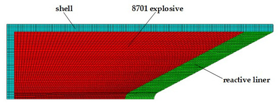 AUTODYN-2D (ANSYS, 17.0) nonlinear dynamics simulation software was used to numerically simulate the reactive jet formation [1,28]. The formation process of the reactive jet has axisymmetric characteristics, so it can be simplified as a two-dimensional axisymmetric problem. The calculation model used the pre-processing software TureGrid for numerical modeling and meshing, and the numerical model is shown in Figure 6. The mesh distortion was significant in the formation process, so the Euler algorithm was used for the explosive and liner, while the Lagrange algorithm was used for the shell and target. The mesh size was 0.5 mm and the target was a gradient mesh. The outflow boundary was set in the Euler area and the target was a fixed constraint boundary.