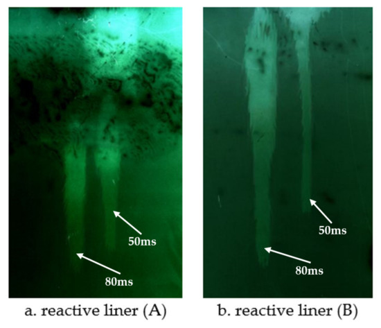 The pulse X-ray test methods and principles of reactive charge cover formation under different charge conditions were the same as mentioned above. Typical X-ray photos of reactive jet formation are shown in Figure 9. The results show that the reactive jet can be formed under different charging conditions, and the reactive shaped jet formed by 8701 explosive is thinner and the jet velocity is higher than that formed by TNT explosive.