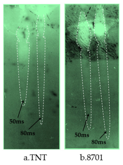Pulse X-ray images under different charging conditions: (a) TNT and (b) 8701 explosive.