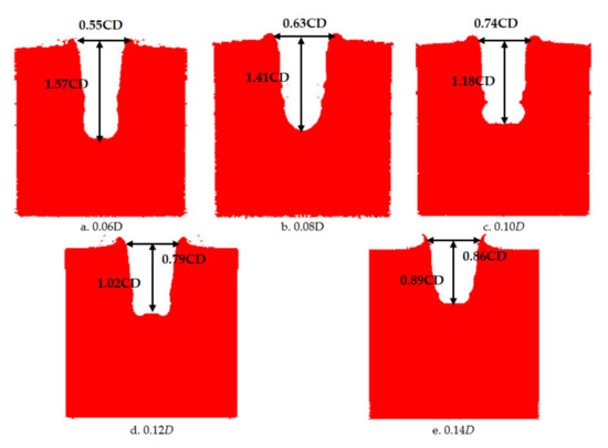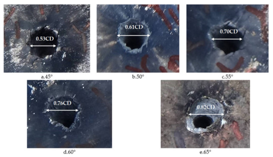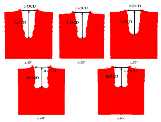 The cone angle of the shaped charge is a factor that must be considered in the design of the shaped charge structure. If the cone angle of the shaped charge is too large or small, it will have a great influence on the armor breaking effect of the reactive jet. When the cone angle is below 30°, the performance of the reactive jet is unstable. When the cone angle is between 30° and 70°, the jet has sufficient velocity and mass. When the cone angle of the charge cover exceeds 90°, the charge cover turns over in the process of deformation and EFP is formed. Therefore, it is necessary to study the influence of the change of reactive materials’ type cone angle on the penetration ability of the reactive jet in order to find the optimal cone angle. The AUTODYN–2D finite element simulation software was used to study the effect of different cone angles on the cover shaped charge’s penetrating steel target damage effect. We selected cover angles of 45°, 50°, 55°, 60° and 65°, and the cover thickness was 0.1 times the charge diameter, with a density of 2.3 g/cm3. The numerical simulation of the damage effect of shaped charges with different cone angles on a steel target is shown in Figure 10. The penetration depth and diameter of the shaped charge with different cone angles are shown in Figure 11.