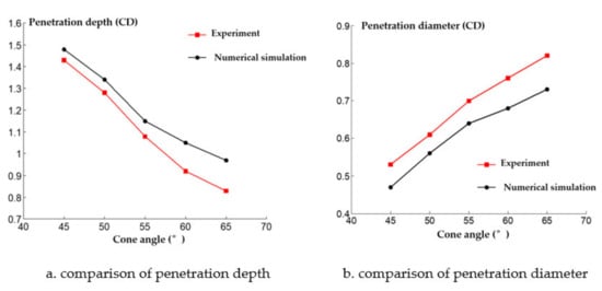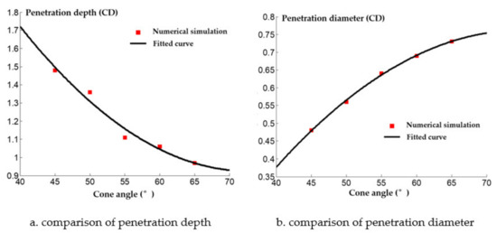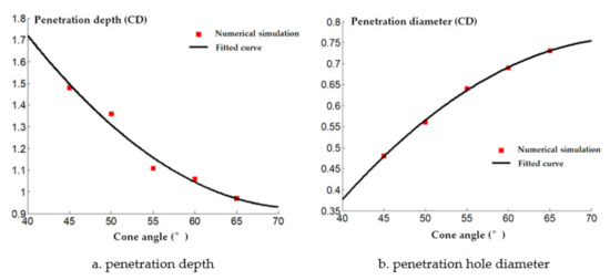 It can be seen in Figure 11 that the jet penetration depth presents an exponential decay trend as the cone angle increases. This is because the type of shield of the cone angle is small and the detonation wave effect on the type of cover makes the crushing speed increase; thus, the reactive jet head speed increases and the jet penetration depth increases. In addition, it can be seen that the penetration diameter of the reactive jet increases as the reactive charge type cover cone angle increases. This is because the average diameter of the reactive jet formed under detonation pressure is small when the cover cone angle of the reactive charge is small.