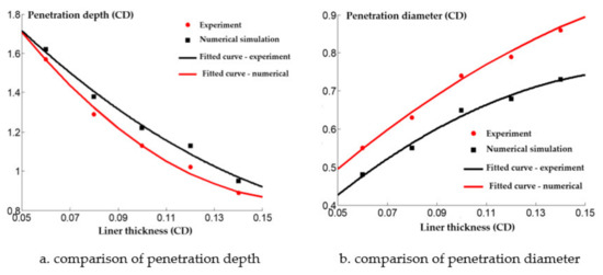 The comparison between the numerical simulation and experimental results of the steel target with different wall thicknesses of the reactive charge liner is shown in Figure 17. The experimental value of the penetration depth into the steel target with different wall thicknesses was consistently lower than the numerical simulation value, but the diameter of the perforation was greater than the numerical simulation value. Although there are some differences between the numerical simulation results and the experimental results, it also qualitatively shows that the penetration law of the shaped charge with different wall thicknesses is similar to the metal jet.