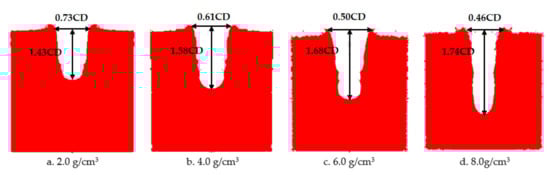 The numerical simulation of the damage effect of the shaped charge with different densities on the steel target is shown in Figure 18. The penetration depth and diameter of shaped charge with different density of reactive charge are shown in Figure 19.