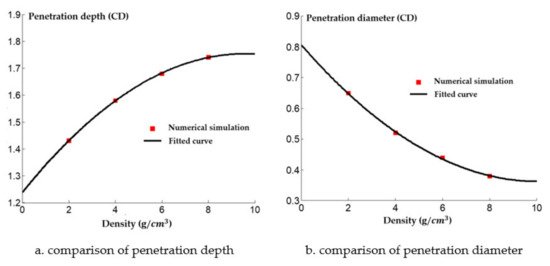 It can be seen from Figure 19 that the penetration depth of the reactive jet into the steel target increases with the increase of the density of the reactive charge liner. From the perspective of steady ideal hydrodynamics theory, the penetration depth of the reactive jet is not related to the velocity of the reactive jet, but is related to the length and density of the reactive jet. When the blasting height and density of the target plate remain unchanged, the armor breaking ability of the reactive jet is related to its own characteristics. The square root of the density is proportional, and the numerical simulation results are approximately consistent with the steady theory. The diameter of the reactive jet to the steel target decreases exponentially with increasing density of the reactive charge liner, which is similar to the decreasing trend of the diameter of the reactive jet with an increase in the material density in Section 2. The average diameter of the reactive jet therefore decreased, resulting in the exponential attenuation of the diameter of the reactive jet to the steel target.