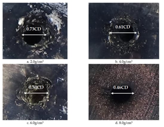 Images of shaped charges with different densities acting on the steel target are shown in Figure 20. It can be seen that as the density of the reactive charge liner increased, the penetration of the reactive jet into the steel target and the remaining unreacted metal powder on the surface of the steel target increased. This is because the increase of the density of the reactive was is due to the addition of high-density inert metal powder in the original formula. The inert metal powder did not participate in the chemical reaction of the reactive material itself but regulates the density of the reactive material.