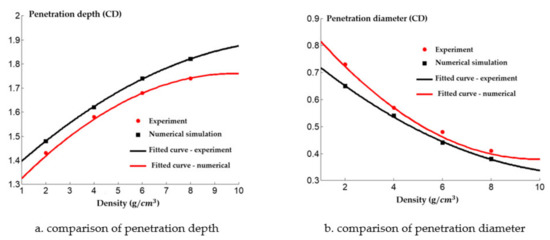 A comparison between the numerical simulation and the experimental results of the steel target with different densities of reactive charge liner is shown in Figure 21. There was a certain difference between the experimental results and the numerical simulation values. The experimental results indicate that the penetration depth of the reactive jet into the steel target was less than that predicted by the numerical simulation, and the difference grows as the density increases. This is because as the density of the reactive charge liner increases, more inert metal powder is added to the reactive material, and the matching displacement is more likely to appear in the pressing process of the reactive charge liner, which has a certain impact on the penetration ability of the reactive jet. In addition, the experimental value of the penetration diameter of the reactive jet to the steel target is larger than that of the numerical simulation, and the difference becomes smaller and smaller with the increase of the density. The increase in the experimental value may have been caused by the implosion of the reactive jet, while the increase in the density of the reactive charge liner gradually reduces the energy content of the reactive jet, which leads to the weakening of the implosion effect of the reactive jet, and the difference therefore reduces.