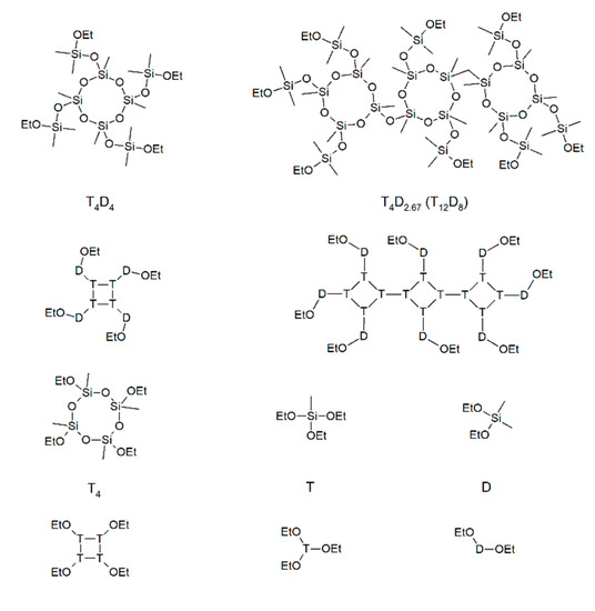 Molecular formulas (denoted at the top) and structural unit compositions (depicted below each molecular formula) of the target macromonomer (T4D4), one of the isomers of the obtained macromonomer (T4D2.67), and other monomers used—2,4,6,8-tetraethoxy-2,4,6,8-tetramethylcyclotetrasiloxane (T4), diethoxydimethylsilane (D), and triethoxymethylsilane (T).