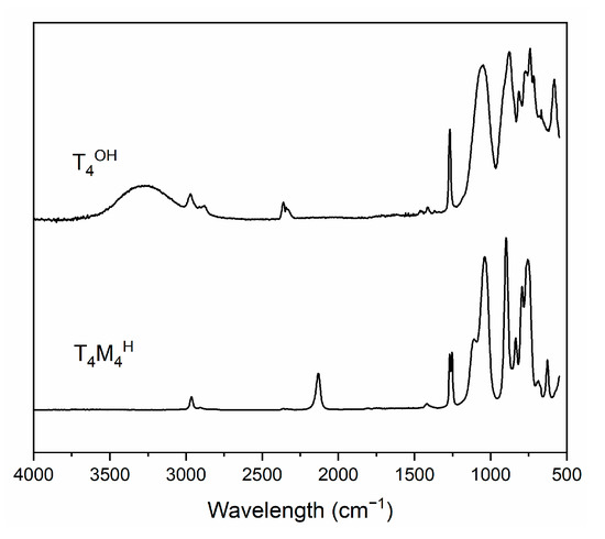 In the case of both spectra, a number of bands typical for siloxanes and silsesquioxanes can be observed. These include stretching vibrations of C-H bonds at 2900–3000 cm−1 [25,31,32,33,34,35,36,37,38,39,40,41], bending vibrations of Si-CH3 groups at about 1270 cm−1 [25,31,38,39,40], and a number of bands that can be attributed to symmetric bending of Si-O-Si bridges between 790 and 900 cm−1 [38,39,40] and Si-O ring with 4 Si atoms bending vibrations at 565–585 cm−1 [39]. The Si-C bond stretching vibrations band can be found at 825–845 cm−1, its intensity enhanced by the coupling with C-H bond vibrations [38]. Vibrations of parts important for the reaction progress investigation are Si-OH stretching vibrations at about 3500–3600 cm−1 [25,31,41,42], which are very weak and can only be found in the case of the T4OH sample and, most importantly, Si-H bond stretching vibrations at about 2130 cm−1 [36,38,39,41,43,44], which are only visible in the case of the T4M2.67H sample. Other differences between spectra can be found between 1000 and 1200 cm−1, where stretching asymmetric vibrations of Si-O-Si can be found [31,38,39,40,41,42,45,46,47]. The T4OH sample has one maximum in that region, while the T4M2.67H sample has two. Bands found in the T4OH sample spectra between 3000 and 3500 cm−1 can be attributed to O-H stretching vibrations [25,39,41], and at about 2350 cm−1 can be attributed to stretching vibrations in CO2 molecules [48]. From these spectra, it can be concluded that both reactions were conducted with nearly 100% efficiency, as bands that can be attributed to vibrations of reactive groups of substrates (namely Si-H and Si-OH) are no longer visible, and bands attributed to the product specific groups (namely Si-OH and Si-H) are present. Additionally, bands at 1000–1200 cm−1 show more a complicated structure of the Si-O-Si backbone in case the of the T4M2,67H sample.