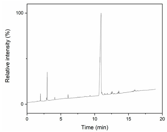The GC chromatogram of synthesis products shows a number of weak signals between 2 and 6 min, which can be attributed to substrates. The most prominent one at 3.1 min shows that a large amount of pyridine was still present in the product after the purification process. This should not have had a large impact on further syntheses, as hydrogen substitution is very fast and polycondensation uses relatively large amounts of hydrochloric acid as a catalyst. Signals registered after 10 min can be attributed to products, with one clearly dominant, which shows that a single product was obtained.