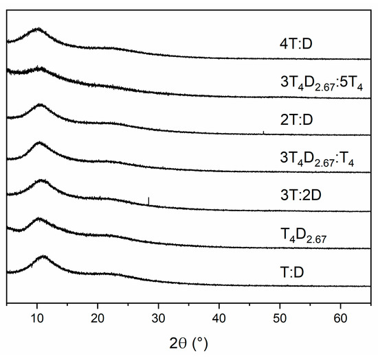 The XRD analysis of all the precursors (Figure 5) shows that all materials were amorphous. The two visible peaks at 10.1–11.0° and 21.5–22.7° are typical for systems based on T units and indicate a pseudo-ladder structure, with the first one corresponding to 8.0–8.8 Å distance between T4 rings building the bulk and the second one corresponding to 3.9–4.1 Å distance between grades in the T-based ladder [25,39,50]. The intensities of these peaks are similar regardless of whether the T4 rings were introduced in the monomers or not. The only difference is observable in the case of the 3T4D2.67:5T4 sample, where these peaks are less visible. This could be caused by more random conformation of T4 rings caused by dissimilarities in monomer structures and a similar molar amount of structural units in these monomers in this mixture, which leads to most random structures.