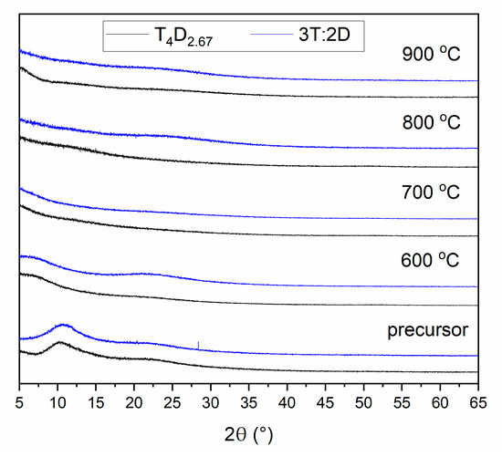 The XRD analysis of samples with 3:2 T:D ratio (T4D2.67 and 3T:2D) obtained in 600, 700, 800 and 900 °C (Figure 6) shows a completely amorphous structure, with traces of precursor structure left after annealing at 600 °C. All other materials showed similar results. This confirms that 900 °C is too a low temperature to observe phase separation regardless of the monomers used.