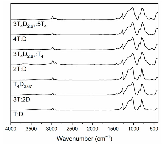 The IR spectra of precursors (Figure 7) are similar to each other and share most bands with these found in the T4D2.67 monomer. This includes bands correlating to stretching asymmetric vibrations of Si-O-Si bridges between 1000 and 1225 cm−1 [31,38,39,40,41,42,45,46,47], especially ladder structure vibrations at about 1205 cm−1 [25,39], as well as O-Si-O structures at 455–470 cm−1 [38,39,43,45,46], and, most importantly, rings containing 4 Si atoms at about 565 cm−1 [39]. Si-C bond stretching vibrations band can be seen at 825–845 cm−1 [38] and complex Si-C-Hx bending vibrations for T and D units can be found at 760–780 cm−1 and 800 cm−1, respectively [51]. The main difference between spectra lies in bands correlated to C-H stretching vibrations at 2850–3000 cm−1 [25,31,32,33,34,35,36,37,38,39,40,41] and Si-CH3 bending vibrations at 1270–1285 cm−1 [25,31,32,33,34,36,37,38,39,40,41] that are a result of different D unit amounts between samples. The barely visible bands at about 3500 cm−1 can be attributed to unreacted Si-OH groups [25,31,41,42] due to sterical limitations, while the broad band between 3000 and 3550 cm−1 can be correlated to OH stretching vibrations in ethanol (~3430 cm−1)/water (~3380 cm−1) occluded in the polycondensed lattice and not removed completely by drying [25,39,41].