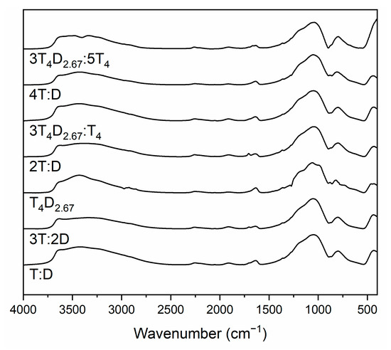 IR spectra of silicon-oxycarbide-based black glasses obtained after annealing at 800 °C (Figure 8) consist of mostly the same bands as precursors, as the bands visible are mainly related to siloxane and the silsesquioxane lattice, which undergoes changes during the ceramization process, while retaining basic structural elements. Two additional bands at about 1710 cm−1 and 1600 cm−1 are correlated with stretching C=O bond vibrations [52] and bending vibrations in water molecules [25,39], respectively. The appearance of these bands in the spectra could be caused by hydrophilization of the material and subsequent adsorption of the water with some dissolved CO2 molecules on the surface of the ground material. This is confirmed by the great increase in the intensity of the band at about 3600 cm−1 attributed to Si-OH stretching vibrations, as well as the band at 3000–3550 cm−1, which in this case can be correlated with adsorbed water O-H stretching vibrations. This band’s intensity, when comparing pairs with the same initial Si:C ratio, shows greater hydrophilicity of the materials obtained from large precursors. This effect becomes less prominent with the decrease of the number of carbon atoms per silicon atom. All materials exhibit smooth a spectrum typical for glassy materials, with the exception of the T4D2.67 sample, where sharper bands and visible bands at 2850–3000 cm−1 attributed to stretching vibrations of C-H bonds indicate that the ceramization process had not been completed. The structure of the SiO2(C)-based lattice was very similar in all cases, with the exception of the 3T4D2.67:5T4 sample, in which case it is typical for materials obtained from the T4-monomer-based samples, while others are similar to materials obtained from simple monomers [28]. The amount of adsorbed water was also similar (due to the high surface charge of the ground powder, preventing precise weighting of samples, quantitative measurements were impossible), with the exception of the T:D and 3T4D2.67:5T4 samples, which adsorbed a significantly greater amount, which indicates the more hydrophilic character of these samples.