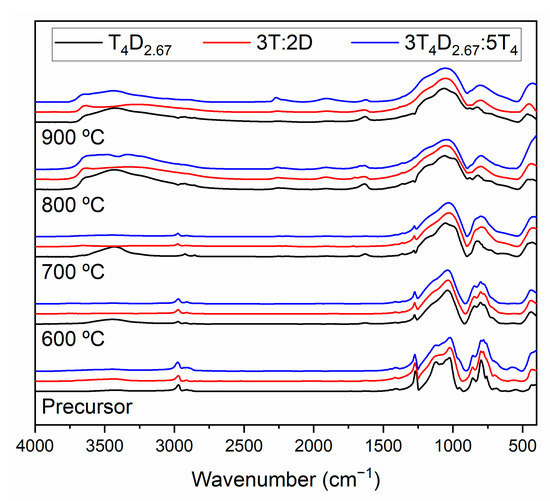 Based on thermal evolution (Figure 9), the precursors can be divided into two groups. In both cases there was a gradual smoothing of spectra features, indicating transition into glassy material from a polymeric one. The difference lies in hydrophilicity; large-monomer-based materials exhibited gradual change, which indicates the loss of organic groups either in the form of volatile hydrocarbons or the formation of a free-carbon phase throughout the annealing process, while simple-monomer-based materials had a distinct change between 700 and 800 °C, which can be connected to the formation of a free-carbon phase during the ceramization process. The 3T4D2.67:5T4 sample behaved similarly to the simple-monomer-based specimen in this regard, which can be attributed to the different distribution of carbon atoms in the bulk, probably due to large domains without D units, as these are fixed to T4D2.67 macromers. These studies also show the stability of the T4D2.67 sample structure, in which case the smooth spectrum of the glassy structure was not achieved even at 900 °C.