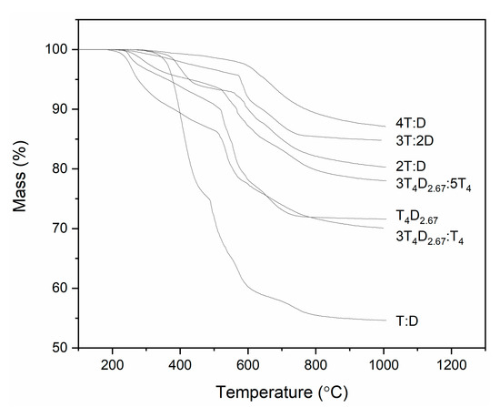 The mass loss in the TG experiment (Figure 10 and Table 1) can firstly be attributed to the loss of occluded solvents, then to the sublimation of oligomers, then to the loss of hydrogen and carbon as molecules with very low molar mass, and finally to the ceramization process [27]. In general, in the case of small monomers, the amount of occluded solvents is minimal. In the case of larger molecules, while initially substantial, it can be removed by drying at 200 °C, and due to the preparation process, it is not shown in the TG experiment. The loss of volatile oligomers that occurs even up to 550 °C was most prominent, as expected, in the case of the T:D sample (25.06%), while in the case of the 4T:D sample, it was negligible (1.92%). In the case of large monomers, this step had the greatest impact on the 3T4D2.67:T4 sample (14.05%), while it was still substantial in the case of other the samples (9.90% for T4D2.67 and 6.07% for 3T4D2.67:5T4). This can be attributed to the need for a solvent, which causes long downtimes between monomers interacting with each other and the ability for macromonomers to fold and form bonds between its own reactive groups, preventing its incorporation into the silsesquioxane matrix, as well as the possibility of T4 monomer dimerization. The small addition of T4 monomers increases the chances of oligomer formation, while larger additions decrease it, as, due to the greater density of reactive groups, T4 monomers enable easier bulk formation. In the second step, the loss of hydrogen and carbon in the form of small organic molecules was similar in most cases (about 7%), except for T:D, T4D2.67 and 3T4D2.67:5T4. In the case of the T:D sample, it can be attributed to the formation of D units rich in nanodomains. For samples including macromonomers, where D units have a forced even distribution, the likely reason is the formation of pendant D units. These units, due to their positioning inside the precursor, were unable to form a second bond. This effect had the greatest impact on the T4D2.67 sample (13.89%), as most monomers here only had eight reactive groups for the 20 structural units. The small addition of T4 decreased the loss to 8.82%, as these monomers can act as linkers. The larger inclusion of T4 monomers reversed the process (a loss of 10.85%), as the possibility of T4-based oligomer creation may sterically hinder the reactions of D units in macromonomers. In the last step, namely ceramization, the loss was similar for all samples (about 4.5%).