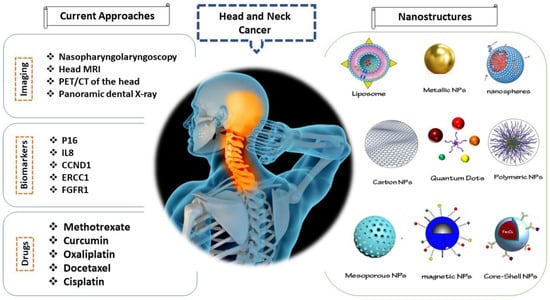 Otherwise, an ideal nanoparticulate system for drug delivery should exhibit the following characteristics: (1) high drug bioavailability, (2) specific targeting, (3) controlled release, (4) low immunogenicity, (5) ability to deliver poorly traditionally bioavailable agents, and (6) sufficient loading capacity [48]. Thus, the review describes and compares (Table 1) the main characteristics of the most used nanosystems for delivering anticancer drugs during HNC treatments. A schematic representation of current approaches for diagnosis and treatment of head and neck cancer and the use of nanostructures to enhance the efficiency of these methods is depicted in Figure 1.