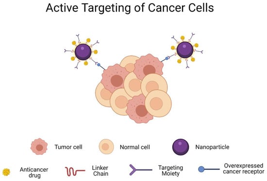 Schematic representation of active targeting of cancer cells by targeting moieties. Targeting moieties allow a specific binding with the overexpressed receptors on tumor cells. Created with BioRender.com.