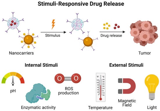 Schematic illustration of stimuli-responsive drug release. Drug release can be started by internal (pH, ROS production, and enzymatic activity) and external (temperature, magnetic field, and light) stimuli.