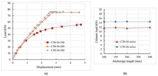 By comparing the ultimate load of different specimens in Figure 14c, it was found that the ultimate load of specimens with an anchorage length of 200 mm in the C30-16 series increases by 21.5% and 64.2%, respectively, compared with specimens with anchorage lengths of 150 mm and 100 mm. It was concluded that when the anchorage length was not sufficient, the ultimate load increases with the increase in anchorage length and the failure mode of the specimen will change from pull-out failure to tensile failure.