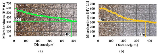 As was mentioned in Section 2.5, the measurement of microhardness was utilized for an evaluation of the depth of the diffusion layers. Microhardness profiles composed with appropriate microstructures in the background are shown in Figure 5 and Figure 6.