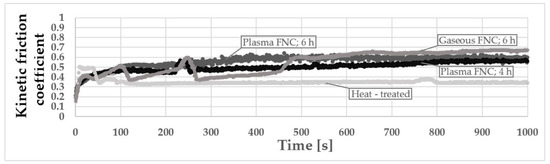 The friction coefficient measurement was performed subsequently. The measurement parameters were set as follows: normal force = 10 N, duration = 1000 s, frequency = 5 Hz, stroke length = 10 mm, temperature = 23 °C, diameter of tungsten carbide ball indenter = 6.35 mm and dry friction. The results of all measurements are plotted together into the graph listed in Figure 7.