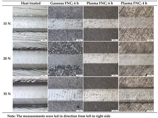 All specimens were subjected to three scratch test measurements at three different constant loads, i.e., 15 N, 20 N and 35 N. Images of such obtained tracks taken by an Olympus DSX500i opto-digital microscope are visible in Figure 8.