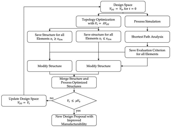Proposed workflow of the optimization for the combination of topology optimization and process assurance. Starting from the initial design space, a TO with a volume target volume