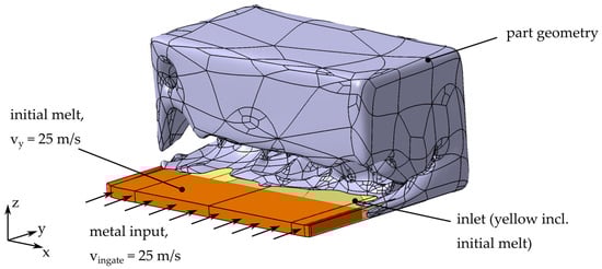 The material used in the HPDC process is aluminum A380 (AlSi9Cu3). The material parameters are listed in the Supplementary Materials (Table S1). A casting temperature of 675 °C prevents solidification of the melt during the mold filling simulation; thermal effects can therefore be neglected.