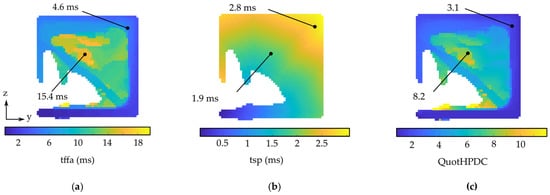 Evaluation of the filling simulation of the HPDC process. The simulation results are shown for a cross section for a part (HPDC simulation, iteration t = 2) during the iterative optimization process. A low quotient indicates cells with a good filling capacity. (a) Time of first fluid arrival, tffa; (b) Time for shortest path length, tsp; (c) Quotient of tffa and tsp, ; For better clarity, the maximum legend is set to 12, although there are a few cells with a value of up to 35.