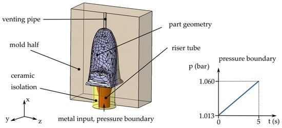 For the LPDC process, the aluminum alloy A356 (AlSi7Mg0.3) is used. The material properties are listed in the Supplementary Materials (Table S2). The casting temperature is defined as 708 °C. The defined heat transfer coefficients for the LPDC simulation are listed in the Supplementary Materials (Table S3).
